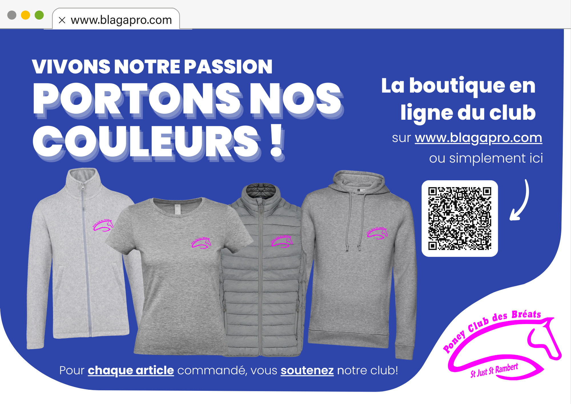 Vous y trouverez l’ensemble de notre collection de vêtements et accessoires aux couleurs du club, conçus pour allier confort, qualité et style. Que vous montiez régulièrement, que vous accompagniez les cavaliers ou que vous souhaitiez simplement soutenir le club, cette boutique est faite pour vous.